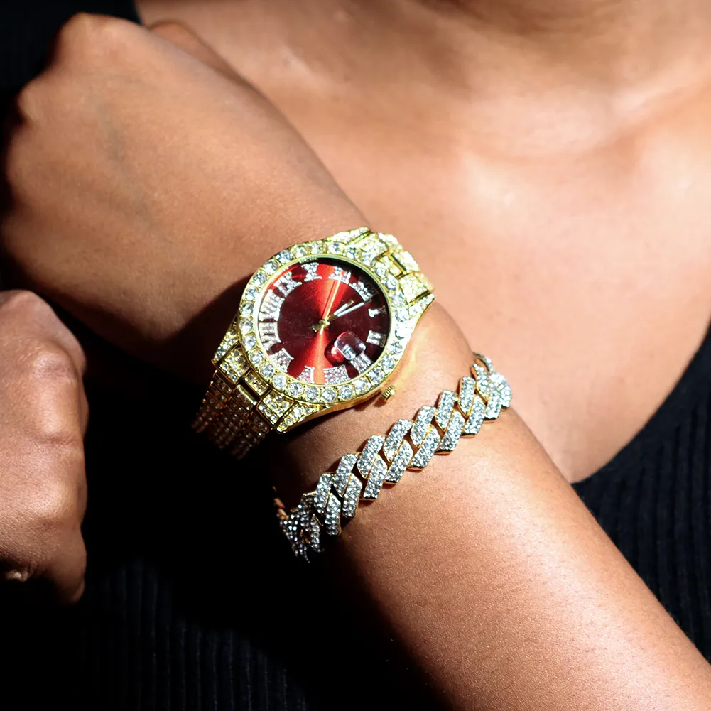 🌟🎇 Découvrez notre collection exclusive de montres et de bracelets à maillons cubains entièrement incrustés de strass, conçue pour les hommes et les femmes à la recherche d'un accessoire élégant et sophistiqué ✨