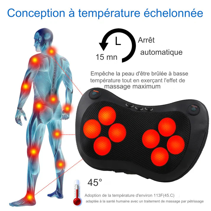 Technologie de Massage Avancée : Équipé de la dernière technologie de massage par pétrissage et chaleur infrarouge, notre coussin simule les mains expertes d'un masseur professionnel, soulageant efficacement les tensions musculaires et la fatigue.